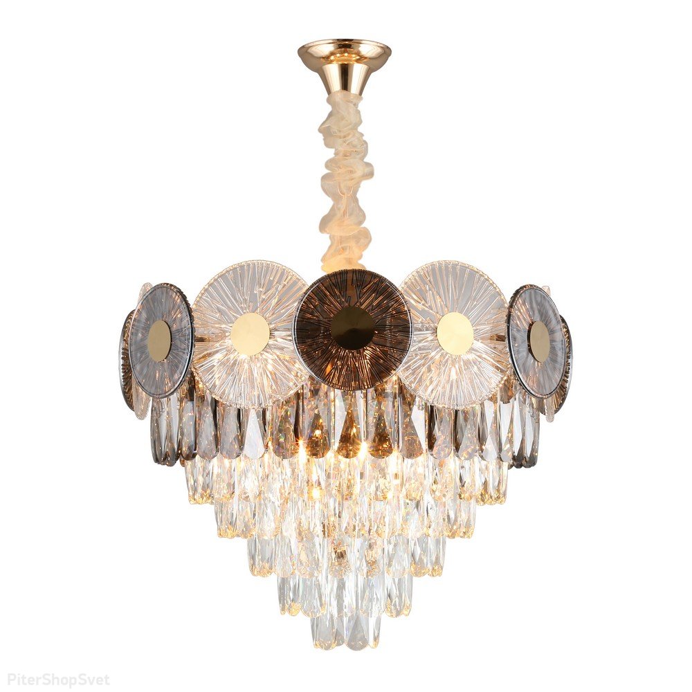 | Внешний вид: | | | Размеры: | высота: 55-100 см, диаметр: 52 см | | Материалы: | металл, хрусталь | | Цвета: | золотой, прозрачный, дымчатый |