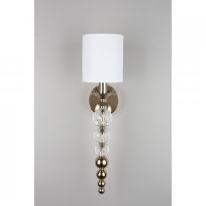 | Внешний вид: | | | Размеры: | высота: 57 см, ширина: 14 см, выступ от стены: 20 см, диаметр основания: 12 см | | Материалы: | металл, текстиль, хрусталь | | Цвета: | латунный, белый, прозрачный |