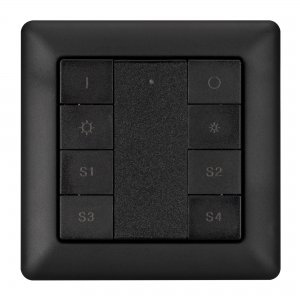 | Описание, дополнительно: | | | Встраиваемая кнопочная черная пластиковая панель для работы по протоколу DALI. Включение/выключение, диммирование, вызов и сохранение 4-х сцен в 1 группе. Установка номера группы и номера первой сцены выполняется переключателями на корпусе. Питание от шины DALI (4 мА). |