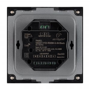 | Описание, дополнительно: | | | Встраиваемая сенсорная стеклянная панель 2.4 ГГц, цвет чёрный. Для управления светодиодными RGBW источниками света (ШИМ). Управление цветом с помощью сенсорной полосы. Работает в режиме master/slave и может выполнять функцию независимого контроллера. Питание/рабочее напряжение 12-24VDC, максимальный ток 3A на канал, 4 канала, максимальная мощность 144-288W. Габариты 86х86х37 мм. Панель совместима с пультами и контроллерами серии SMART. |
