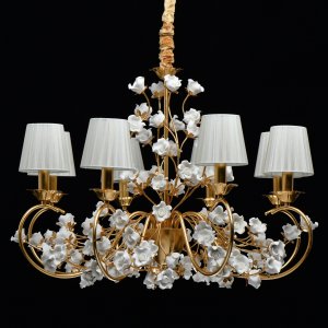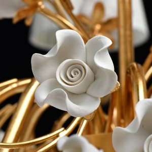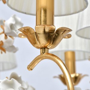 Основание светильника выполнено из металла и покрыто сусальным золотом. Текстильные абажуры из органзы. декорирован цветами ручной работы из неглазурированного фарфора