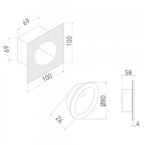 Размеры:высота: 8 см, ширина: 8 см, толщина: 2,8 см, монтажный стакан: 6,9*6,9*5,1 см