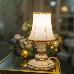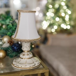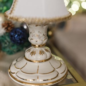 | Дополнительно: | | | Основание изготовлено из высококачественного фарфора, расписано 24-каратным золотом вручную мастерами Гжельского завода. Рисунок каждой фарфоровой детали уникален и неповторим. Абажур изготовлен из габардина белого цвета, идеально сочетается с белоснежным фарфором. Белый, цвет чистоты и гармонии, может слиться с фоном в светлом интерьере или стать акцентом в темном. Одновременно простой и элегантный, он украсит любое пространство. Тканевый абажур создает уютную, располагающую атмосферу, мягко рассеивает свет; гарантирует отсутствие бликов на Вашем телевизоре. Абажур прост в уходе: пыль с него можно легко удалить мягкой щеткой. |