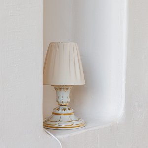 Внешний вид: | | Размеры: | высота: 29 см, диаметр: 16 см, диаметр основания: 16 см, вес: 1.5 кг | Материалы: | фарфор, ткань габардин | Цвета: | белый, шампань, узор 24-каратным золотом, рисунок бабочки |
