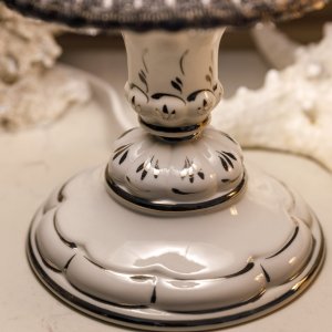 Внешний вид: | | Размеры: | высота: 29 см, диаметр: 16 см | Материалы: | фарфор, ткань габардин | Цвета: | белый, узор платиной |