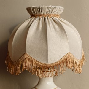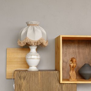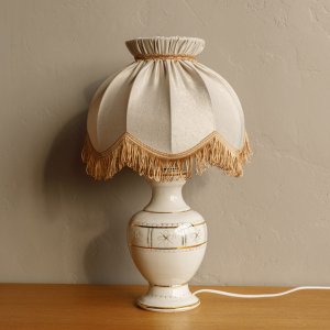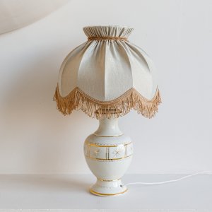 Внешний вид: | | Размеры: | высота: 50 см, диаметр: 31 см, высота абажура – 23 см, верхний диаметр абажура – 16 см, вес: 3 кг | Материалы: | фарфор, мягкая ткань софт | Цвета: | белый расписанный 24-каратным золотом, бежевый золотистый |