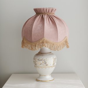 Внешний вид: | | Размеры: | высота: 50 см, диаметр: 31 см, высота абажура – 23 см, верхний диаметр абажура – 16 см, вес: 3 кг | Материалы: | фарфор, ткань канвас | Цвета: | белый расписанный 24-каратным золотом, пыльная роза (розовый) |