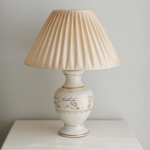 Внешний вид: | | Размеры: | высота: 49 см, диаметр: 39 см, высота абажура – 22 см, верхний диаметр абажура – 16 см, вес: 3 кг | Материалы: | фарфор, мягкая ткань софт | Цвета: | белый расписанный 24-каратным золотом, шампань |