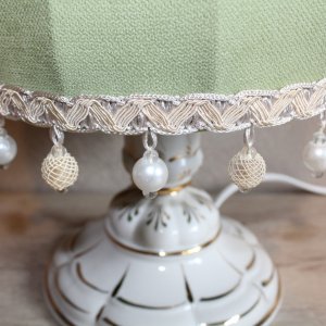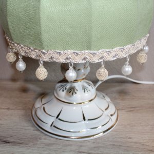 Внешний вид: | | Размеры: | высота: 33 см, диаметр: 21 см, диаметр основания: 16 см, вес: 2 кг | Материалы: | фарфор, ткань канвас, тесьма, бусины | Цвета: | белый, фисташковый (зелёный), узор 24-каратным золотом, перламутровый |