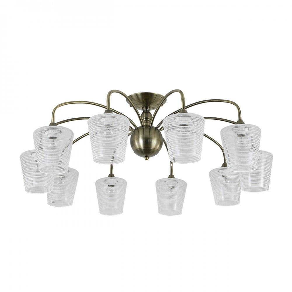| Внешний вид: | | | Размеры: | высота: 29 см, диаметр: 82 см, диаметр основания: 15 см, плафон: D13*h13 см | | Материалы: | металл, стекло | | Цвета: | античная бронза, прозрачный с белым рисунком |