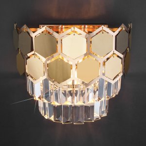 | Внешний вид: | | | Размеры: | высота: 21.5 см, ширина: 25 см, выступ от стены: 12.5 см | | Материалы: | металл, хрусталь | | Цвета: | золотой, прозрачный |