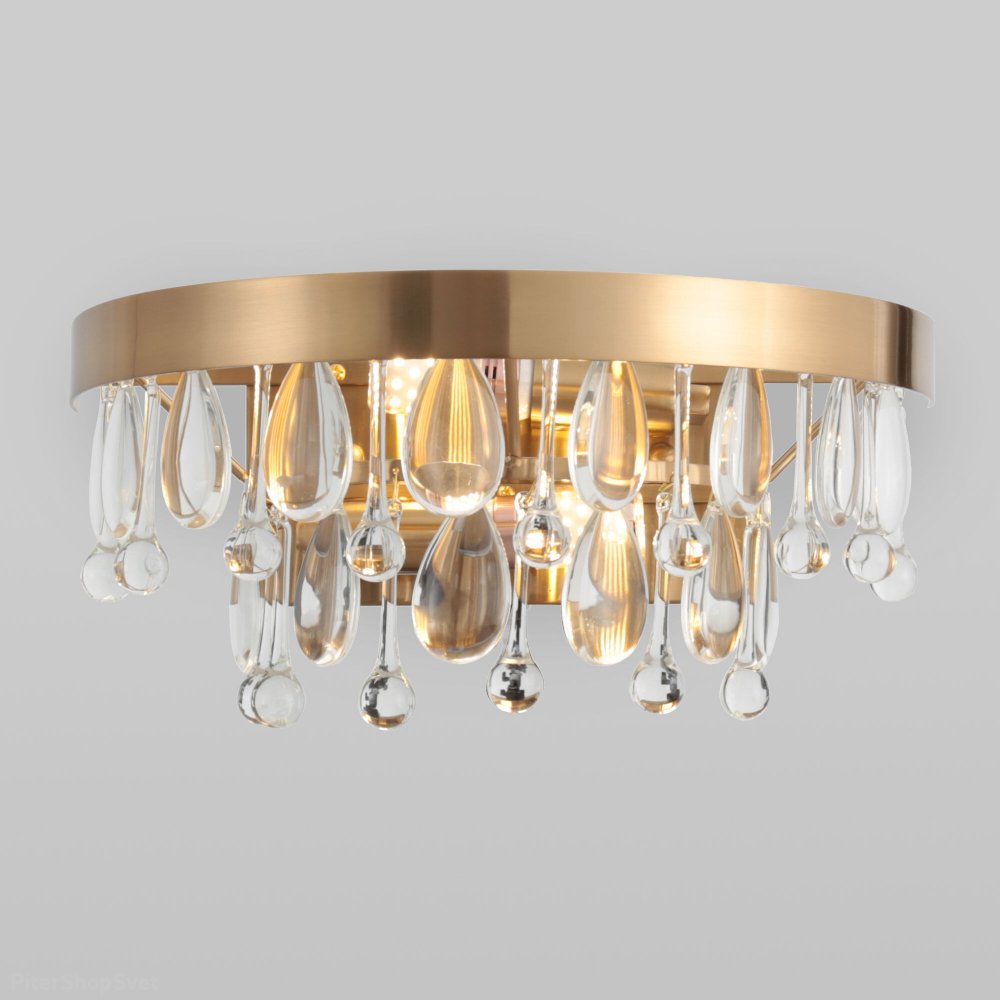 | Внешний вид: | | | Размеры: | высота: 15 см, ширина: 33 см, выступ от стены: 19 см | | Материалы: | металл, хрусталь | | Цвета: | латунный, прозрачный |