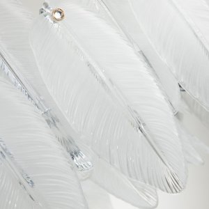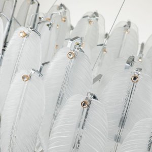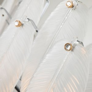 | Внешний вид: | | | Размеры: | высота: 60-123 см, диаметр: 80 см | | Материалы: | металл, стекло | | Цвета: | хром, полу-прозрачный, декор в виде кристалла в золотом обрамлении на каждом пере |