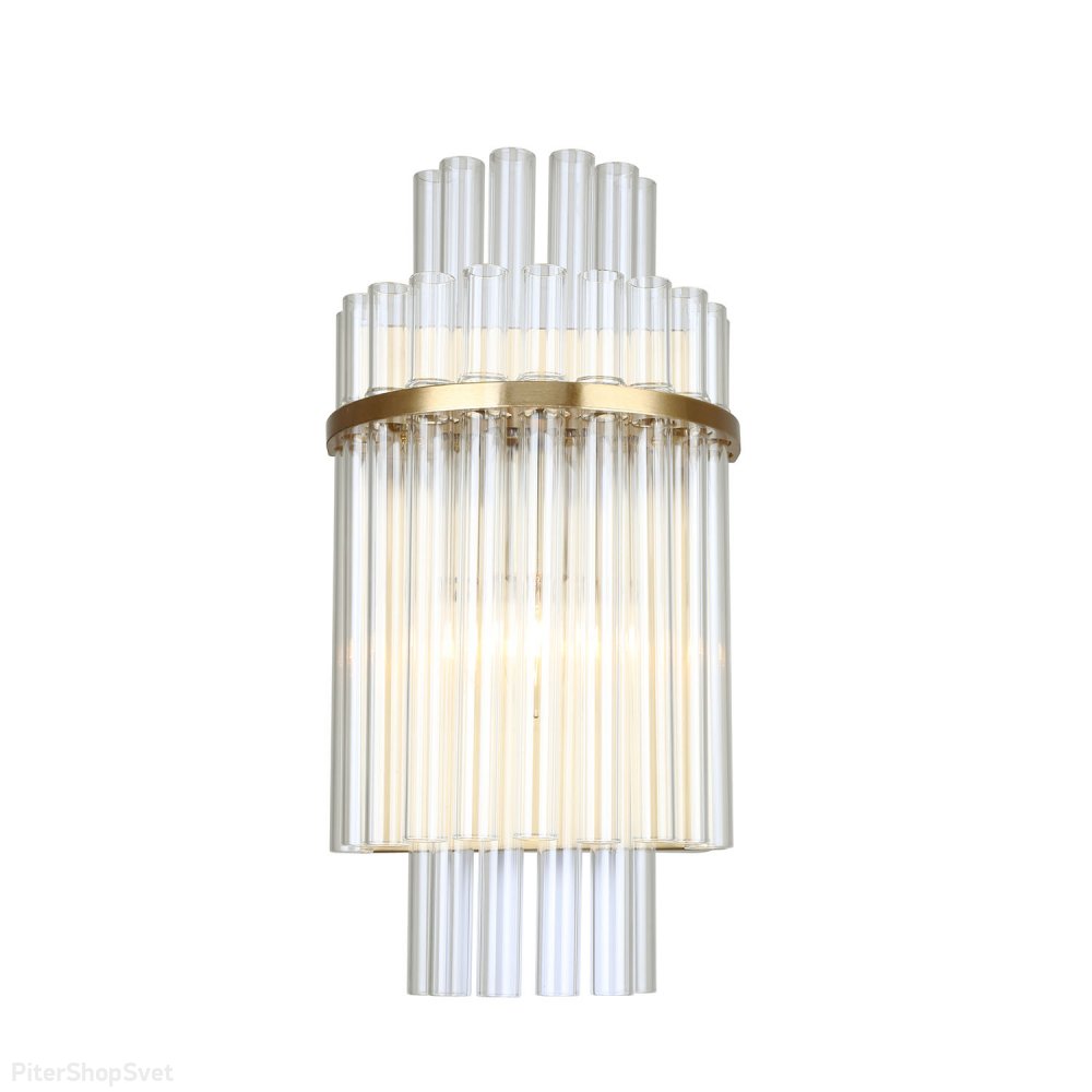 | Внешний вид: | | | Размеры: | высота: 37 см, ширина: 18.5 см, выступ от стены: 13 см, вес: 2.4 кг | | Материалы: | металл, стекло | | Цвета: | латунный, прозрачный |
