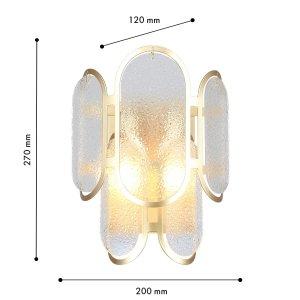 | Внешний вид: | | | Размеры: | высота: 27 см, ширина: 20 см, выступ от стены: 12 см | | Материалы: | металл, стекло | | Цвета: | латунь, прозрачный |