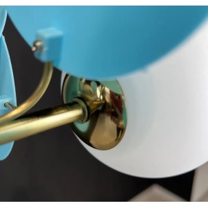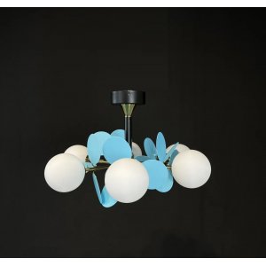 | Внешний вид: | | | Размеры: | высота: 27 см, диаметр: 55 см, диаметр основания: 8 см, диаметр плафона: 12 см | | Материалы: | металл, стекло | | Цвета: | чёрный, золотой, белый, голубой |