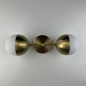 | Внешний вид: | | | Размеры: | высота: 38 см, выступ от стены: 15 см | | Материалы: | металл, стекло | | Цвета: | латунный, белый |