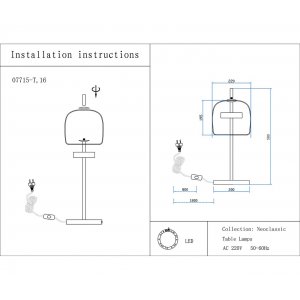 Размеры:высота: 58 см, диаметр: 22 см, диаметр основания: 20 см, высота плафона: 19.5 см, провод (полимер): 180 см