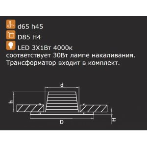 | Характеристики |  | | Источник света: | | | Лампа: | Светодиоды 3 Вт | | Цветовая температура: | 4000K (Белый чистый) |