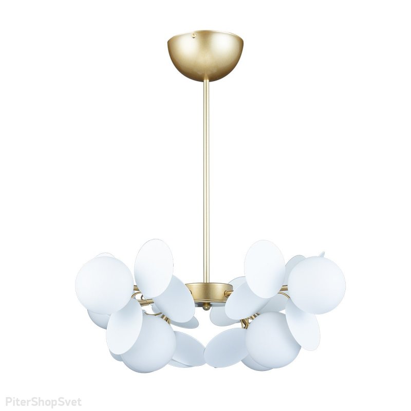 | Внешний вид: | | | Размеры: | высота: 66,5 см, диаметр: 60 см, высота штанги: 40см, диаметр потолочной чаши: 10 см | | Материалы: | металл, стекло | | Цвета: | золотой, белый |