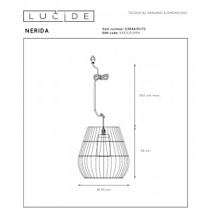 | Внешний вид: | | | Размеры: | высота: 40-389 см (изменяется при монтаже), диаметр: 35 см, провод (полимер): 350 см, вес: 1.5 кг | | Материалы: | металл, полимер под ротанг | | Цвета: | чёрный, бежевый |