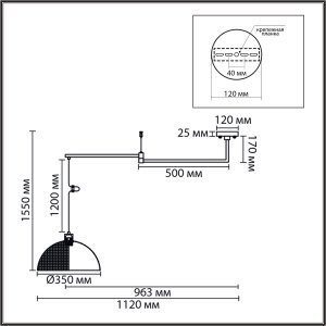 | Внешний вид: | | | Размеры: | высота: 50-155 см, длина: 112 см, ширина: 35 см, диаметр: 35 см, диаметр основания: 12 см, высота основания: 2.5 см, длина провода / подвеса: 120 см | | Материалы: | металл | | Цвета: | чёрный, белый внутри |