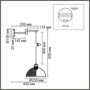 | Характеристики |  | | Внешний вид: | | | Размеры: | высота: 30-60 см, ширина: 25 см, выступ от стены: 43 см, диаметр основания: 10 см, высота основания: 2.5 см, длина провода / подвеса: 40 см | | Материалы: | металл | | Цвета: | чёрный, белый внутри |