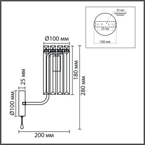 | Внешний вид: |   |  | Размеры: | высота: 28 см, ширина: 10 см, выступ от стены: 20 см, диаметр основания: 10 см |  | Материалы: | металл, хрусталь |  | Цвета: | золотой, прозрачный |