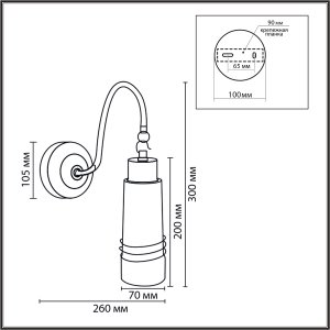 | Внешний вид: | | | Размеры: | высота: 30 см, ширина: 7 см, выступ от стены: 26 см, диаметр основания: 10.5 см | | Материалы: | металл, керамика | | Цвета: | бронза, чёрный |