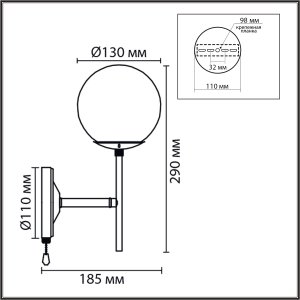 | Внешний вид: | | | Размеры: | высота: 29 см, ширина: 13 см, выступ от стены: 18.5 см, диаметр основания: 11 см | | Материалы: | металл, стекло | | Цвета: | чёрный, белый, латунь |