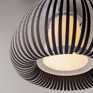 В отличие от традиционной техники, основа серии Kirigami не бумага, а органза. Тонко нарезанные полоски ткани собраны в куполообразный абажур с усечённой вершиной, что добавляет динамики дизайну и делает конструкцию визуально более воздушной. Серия представлена в двух цветах: монохромный белый и контрастный черный. Внутри абажура установлен белый хлопковый рассеиватель, скрывающий сменный источник света с цоколем Е27, который обеспечивает мягкое комфортное глазу освещение, создавая уютную и располагающую атмосферу. Металлическая арматура подвесных светильников и настольной лампы серии Kirigami окрашена в белый цвет с антибликовым покрытием.