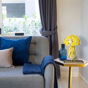 Основание настольной лампы выполнено из высококачественного акрила черного цвета. Плафон в форме гриба выполнен из стекла, окрашенного в массе в желтый, белый, голубой и черный цвета.