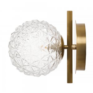 | Внешний вид: | | | Размеры: | высота: 20 см, ширина: 15 см, выступ от стены: 23 см, диаметр основания: 13 см | | Материалы: | металл, стекло | | Цвета: | латунный, прозрачный |
