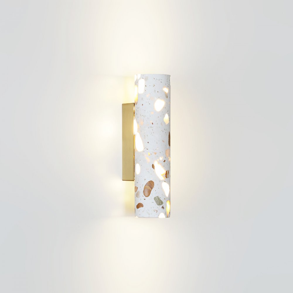 | Внешний вид: | | | Размеры: | высота: 30 см, ширина: 7 см, выступ от стены: 10 см | | Материалы: | металл, терраццо | | Цвета: | латунь, белый |