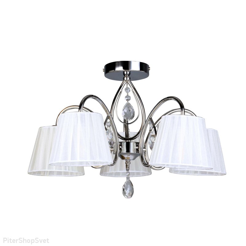| Внешний вид: | | | Размеры: | высота: 30 см, диаметр: 56 см | | Материалы: | металл, текстиль, хрусталь | | Цвета: | хром, белый, прозрачный |