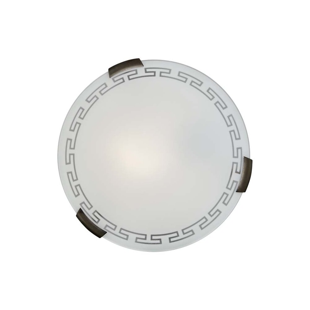 | Внешний вид: | | | Размеры: | высота: 8 см, диаметр: 30 см | | Материалы: | металл, стекло | | Цвета: | белый, матовый с прозрачным узором, бронза |
