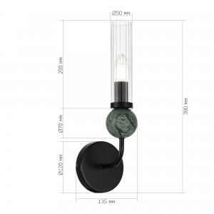 | Внешний вид: | | | Размеры: | высота: 39 см, ширина: 7 см, выступ от стены: 13.5 см, диаметр основания: 12 см | | Материалы: | металл, стекло, камень мрамор | | Цвета: | чёрный, прозрачный, зелёный мрамор |