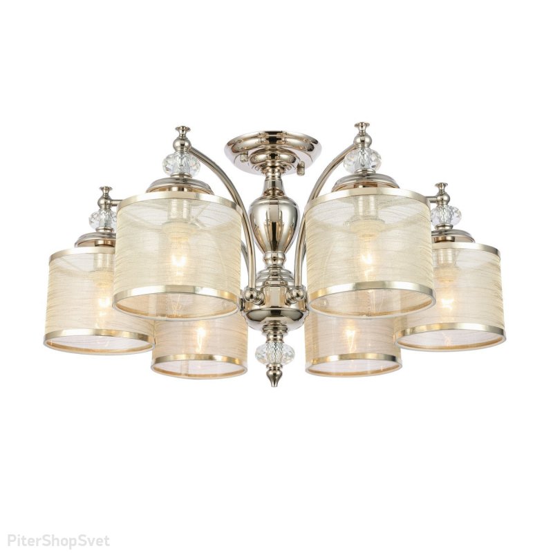 | Внешний вид: | | | Размеры: | высота: 38 см, диаметр: 68 см | | Материалы: | металл, текстиль, хрусталь | | Цвета: | никель, золотой |