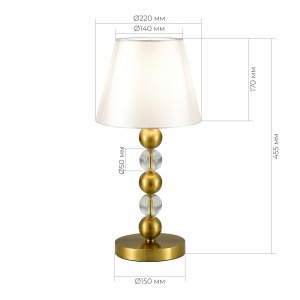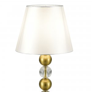 Внешний вид: | | Размеры: | высота: 45.5 см, диаметр: 22 см, диаметр основания: 15 см | Материалы: | металл, текстиль, стекло | Цвета: | латунь, белый, прозрачный |