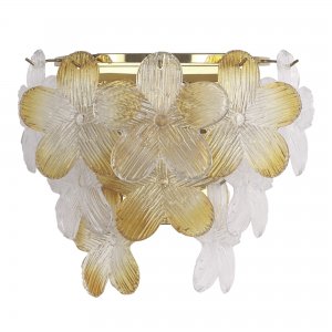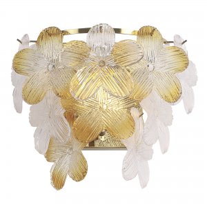 | Внешний вид: | | | Размеры: | высота: 28 см, ширина: 32 см, выступ от стены: 19 см | | Материалы: | металл, стекло | | Цвета: | золотой, прозрачный, янтарный |