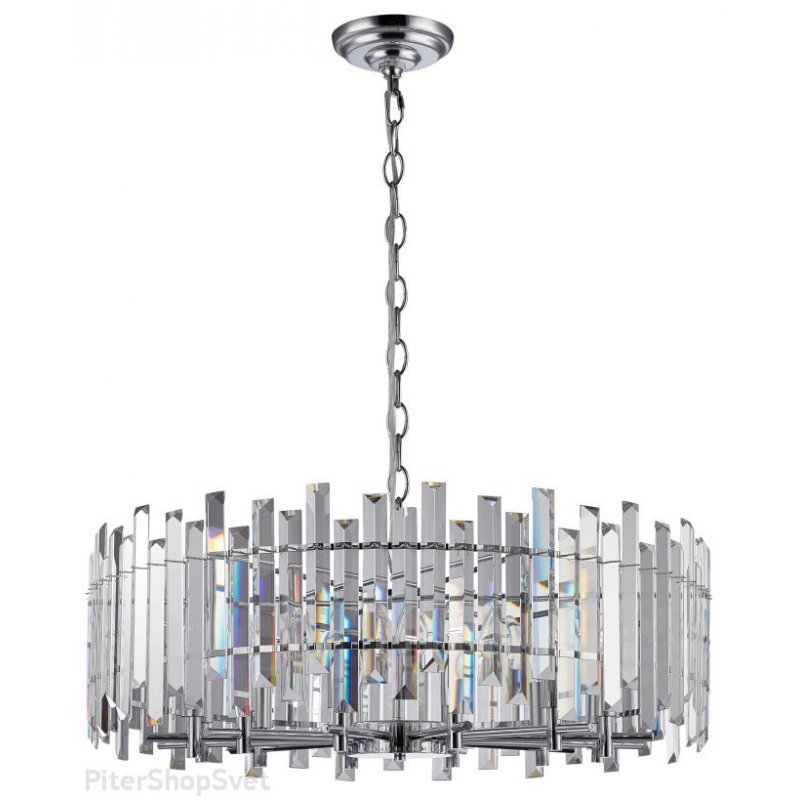 | Внешний вид: | | | Размеры: | высота: 80 см, высота без цепи: 30 см, диаметр: 80 см | | Материалы: | металл, хрусталь | | Цвета: | хром, прозрачный |