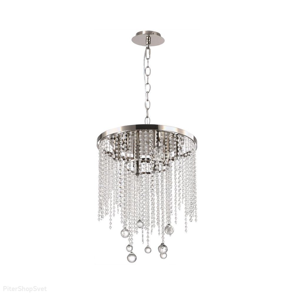 | Внешний вид: | | | Размеры: | высота: 120 см, диаметр: 60 см, диаметр основания: 13 см | | Материалы: | металл, хрусталь | | Цвета: | никель, прозрачный |