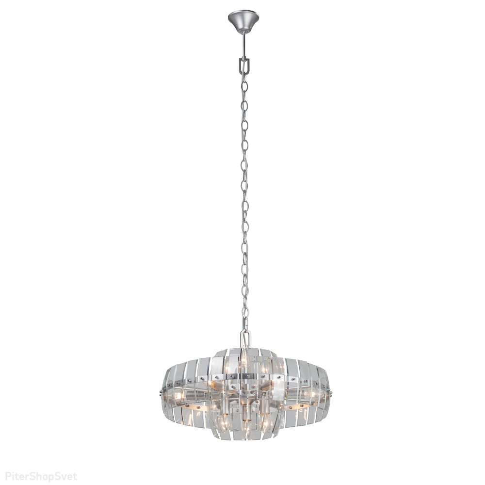 | Внешний вид: | | | Размеры: | высота: 50-164 см, диаметр: 62 см, диаметр основания: 12 см, цепь: 125 см, вес: 7.6 кг | | Материалы: | металл, стекло | | Цвета: | серебро, прозрачный |
